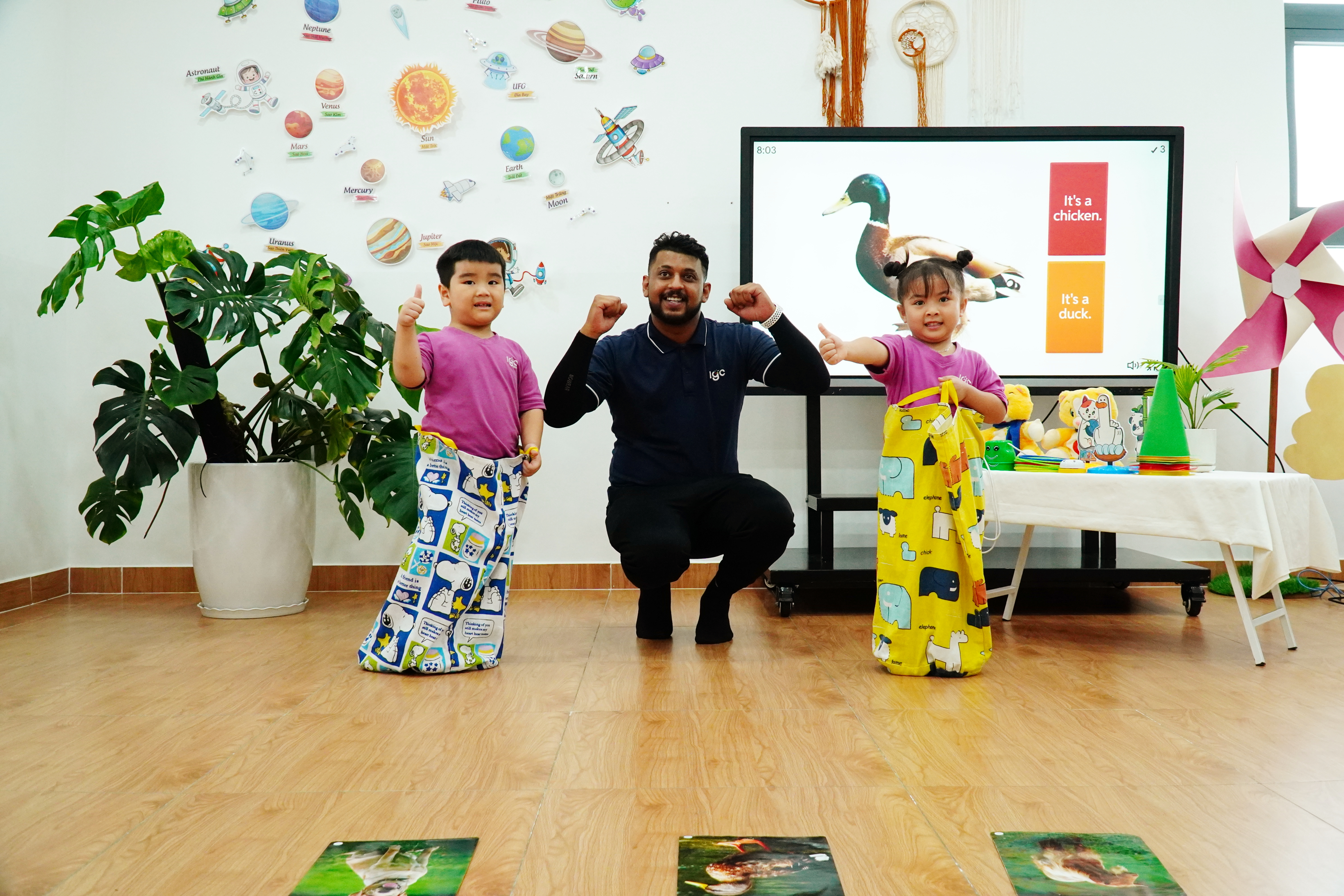 Chương trình giáo dục với 2 buổi học tiếng Anh hàng tuần cùng 100% giáo viên nước ngoài cung cấp kiến thức tiếng Anh vỡ lòng cho trẻ cùng ngữ pháp cơ bản để trẻ tiếp cận tiếng Anh như một ngôn ngữ thứ hai. Các thẻ từ, hình ảnh màu sắc cùng các bài hát sinh động được sử dụng liên tục để khơi gợi sự hứng thú và khuyến khích trẻ vận động trong lúc học tiếng Anh.